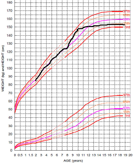 圖二、中樞性早熟之身高生長曲線範例 (未治療)。