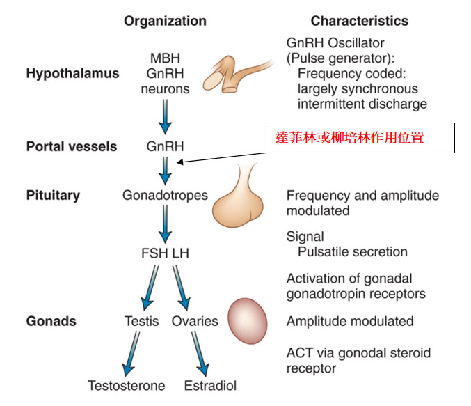 圖四、Hypothalamic-pituitary-gonadal (HPG) axis 以及柳菩林(Leuplin)作用位置